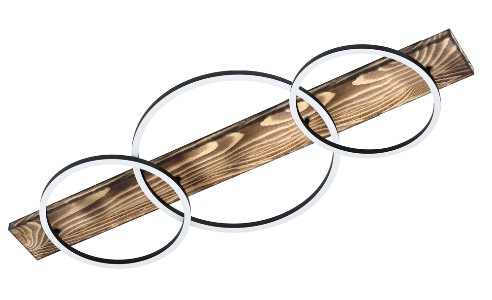 The Boyal LED three light pendant by Eglo has a rustic yet refined appearance. This pendant light features a brushed pine wood finish. Its integrated LED light source emanates from the three black circular rings creating a look that’s both rustic and modern
