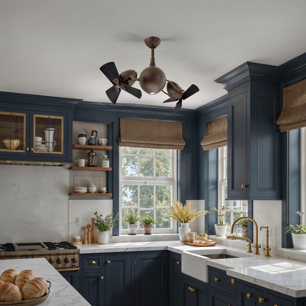 The Acqua rotational fan is thoughtfully designed to resemble the molecular structure of water, Earth's most precious resource. The Acqua offers fluid lines and quiet axial rotation. The fan heads can be infinitely positioned in 180-degree arcs for optimum air movement; the greater the angles of the motors to the horizontal support rods (up or down), the faster the axial rotation. A slow, controlled axial rotation is achieved by both fan head position and fan blade speed. Matthews rotational fans circulate heat and air-conditioning more efficiently than traditional paddle fans.