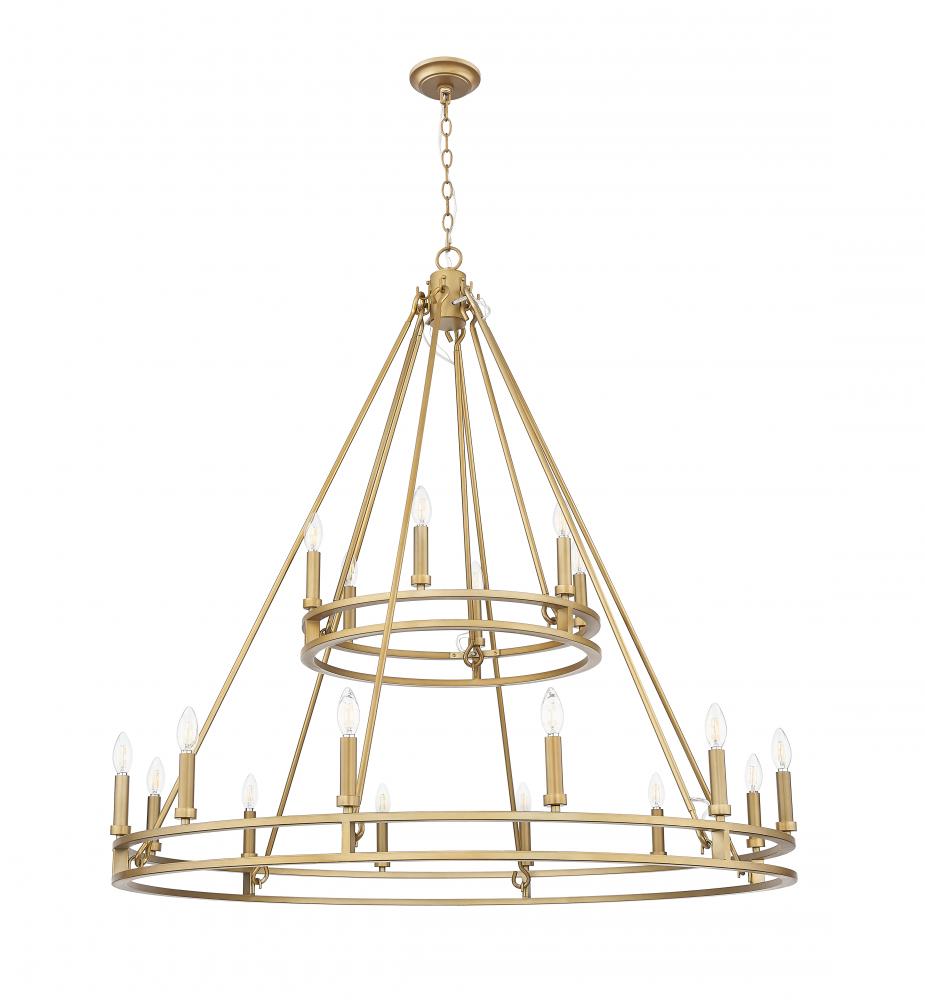 Gracefully expansive yet remarkably restrained, the Dennison chandelier in signature brass delivers warm illumination through its elegant, airy frame. With eighteen lights, it anchors large spaces with modern elegance.