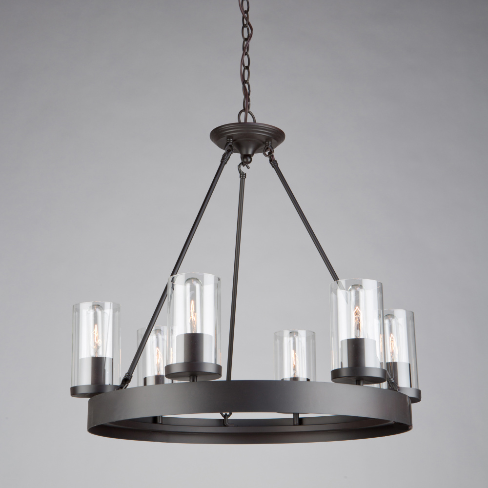 The Menlo Park Collection is painted in a dark chocolate finish, and complimented with a clear cylinder glass. Spherical clean lines throughout gives this collection the status of an instant classic. Shown with Edison filament bulbs to convey the retro look. 6 Light Chandelier