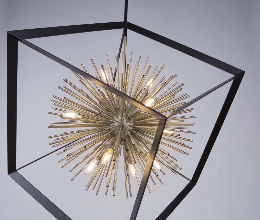 The Sunburst Collection chandelier is unique and a definitely beautiful focal point. The exterior frame is matte black encasing a satin brass cluster of thin hollow rods. (Smaller size and flush mount also available)
