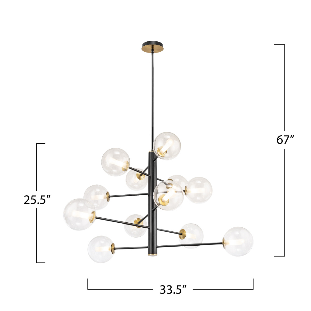 The Aurelia Collection is defined by its contemporary allure, featuring a black frame with brass accents. Each arm of the chandelier is adorned with beautiful spherical clear glassware, creating a visually striking contrast and emitting a soft, inviting illumination. This collection seamlessly marries sleek design with a warm aesthetic, making it a stylish and captivating addition to any space. 12 light chandelier shown. (height adjustable via extra rods included)