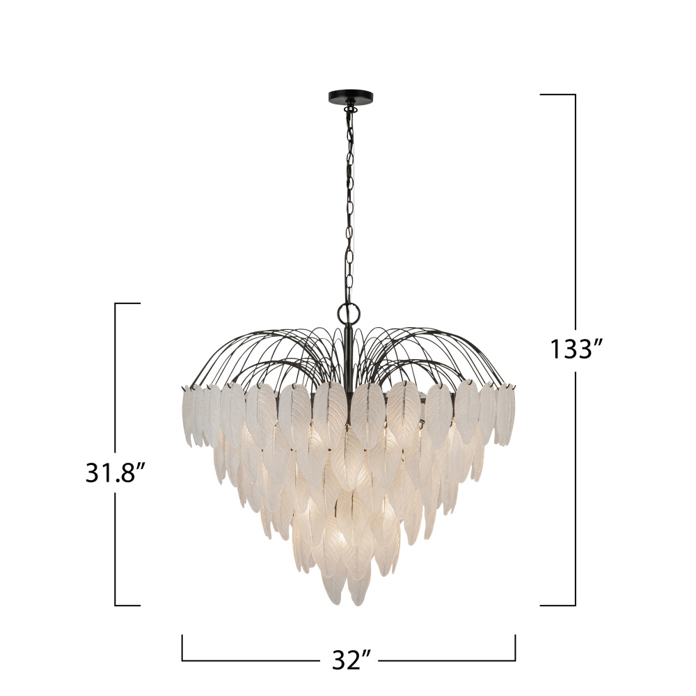 The Alessia Collection chandelier is a captivating blend of modern elegance and nature-inspired artistry. Its bold black frame cradles cascading glass leaves, each etched with organic, lifelike details that evoke a serene forest canopy. With its enchanting glow, this chandelier helps transforms any space. (32" inch diameter)