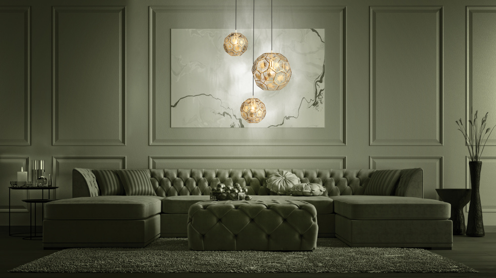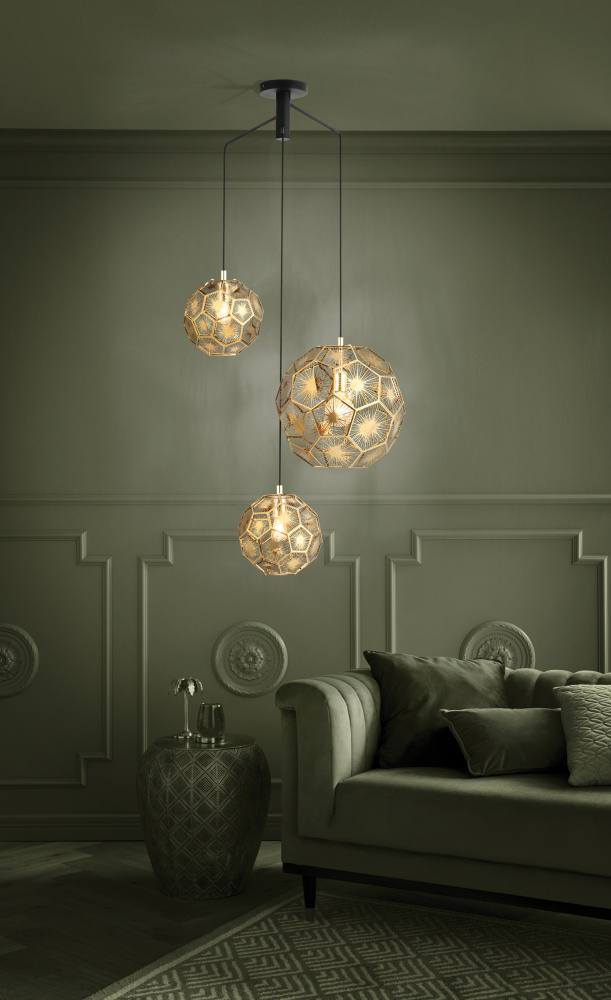 3 LT Round Cascade Pendant w/ Black Finish & Brass Geometric Design Shades