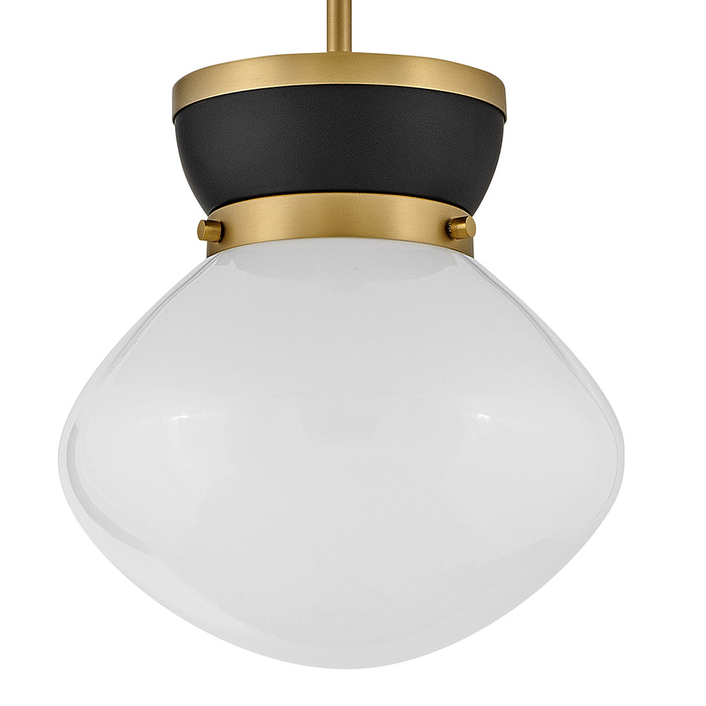 Lucy is a petite beauty that packs a big punch. The curved lines and captivating color combinations are like a whirlwind romance with classic style. The schoolhouse modern shade and bands of Lacquered Brass finish off the timeless love story with a softness that fits in any space or place.