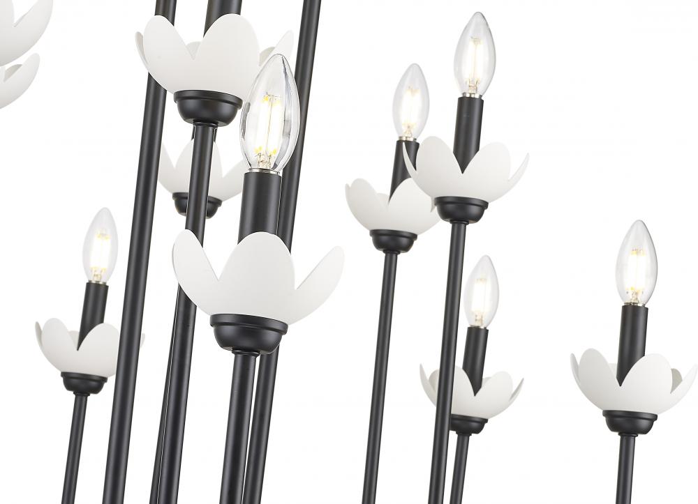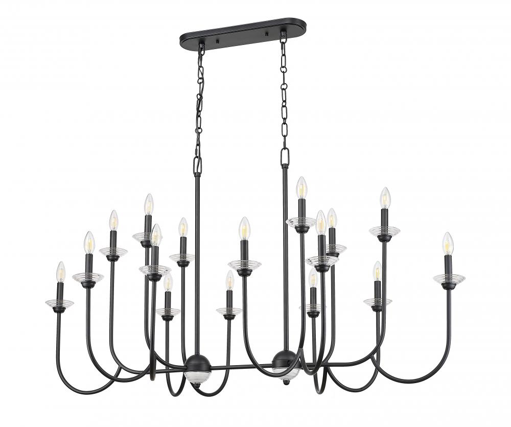 Slender, curving arms create a light, almost airy silhouette for this transitional 16-light linear chandelier. IN matte black for optimal contrast, it features delicate floral bobeche details and is adorned with a matching pair of clear glass spheres that add glittering radiance. Its the perfect solution for an approachable and inviting living or dining space.