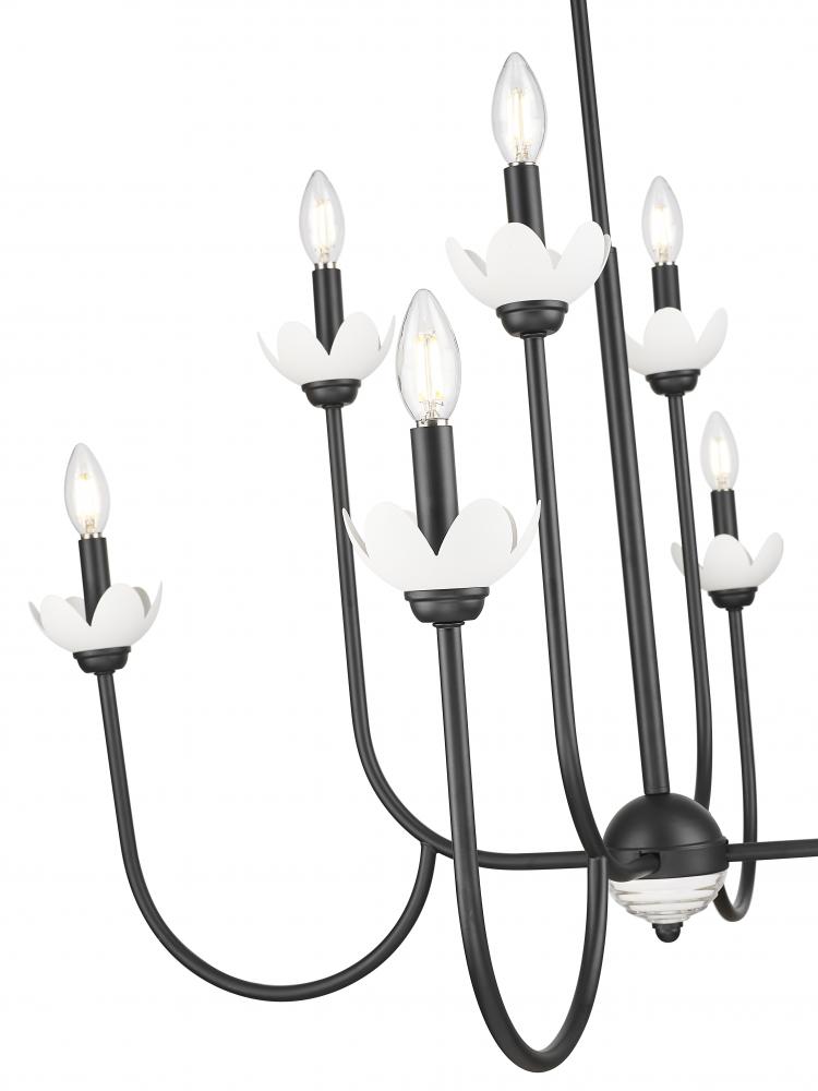 Delicate floral bobeches, in interchangeable white metal and clear glass, highlight this transitional eight-light chandelier. Perfect over a foyer or in your dining room, it offers a clean, fresh ambiance with a center sphere of clear glass and a matte black finish that adds contrast and depth. Curvy arms create a two-tiered silhouette and ensure an inviting ambiance in any setting.